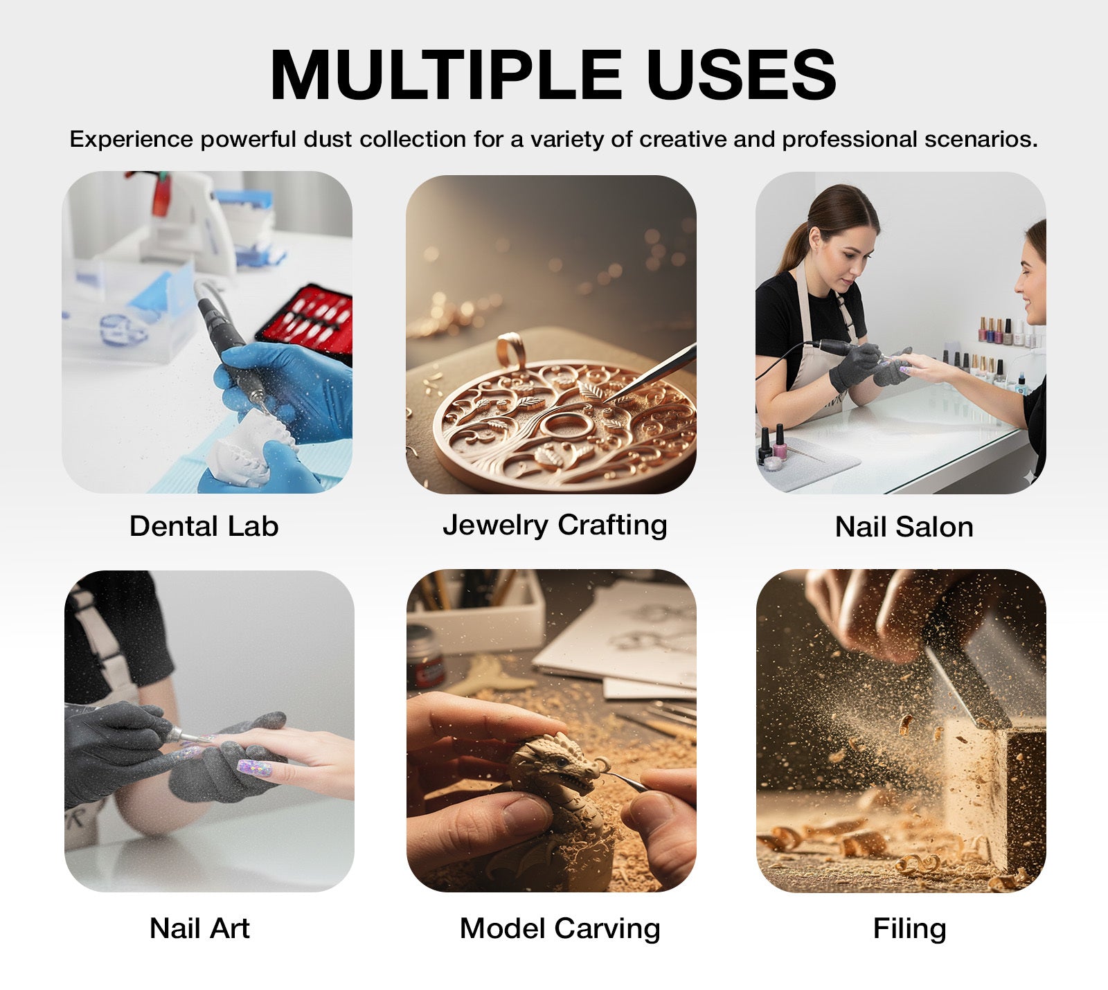 Powerful and quiet dust extraction system with built-in LED lighting and flexible 360° hose. Filters up to 96% of fine particles (PM2.5), keeping your workspace clean and safe. Ideal for grinding, polishing, and daily lab use. Replaceable filter, low noise, and 10,000h motor lifespan.
